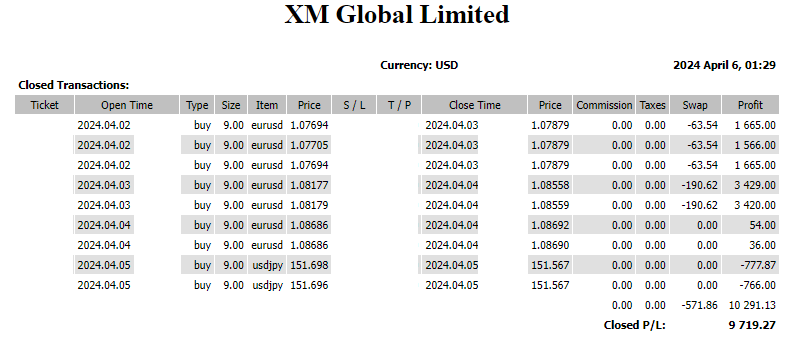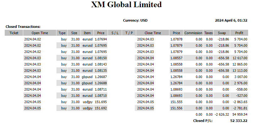 4月1日~4月5日のトレードは合計 +940万円(+62,052 USD)でした。HEADLINE